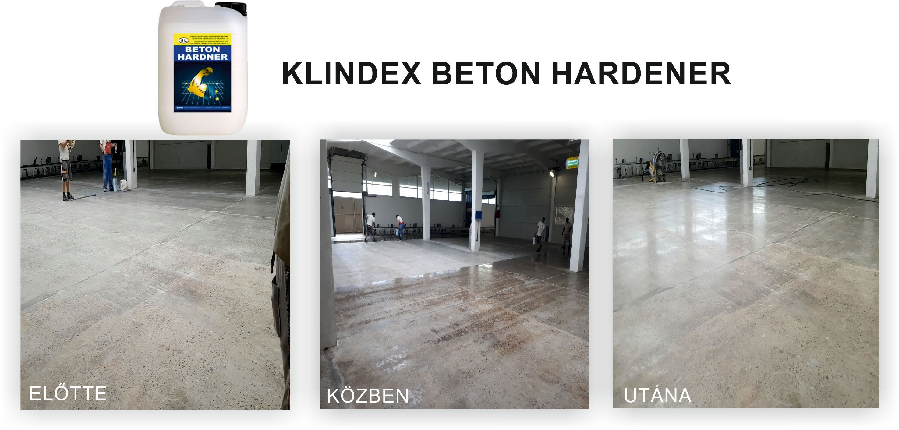 A Klindex Beton Hardener egy betonkeményítő kezelőszer, amely behatolva a beton szerkezetébe tömörebbé és kopásálóvá teszi a betonpadlót. A Klindex Beton Hardener használata után a felület erősebb/keményebb lesz, valamint megnő a kopássállóság és megakadályozza a beton porzását. A Beton Hardener-el kezelt felület ellenállóvá válik a különböző zsírok, olajok és az egyéb behatások ellen. Nem utolsó sorban a fentiek mellet a padló karbantartása is sokkal könnyebbé válik.